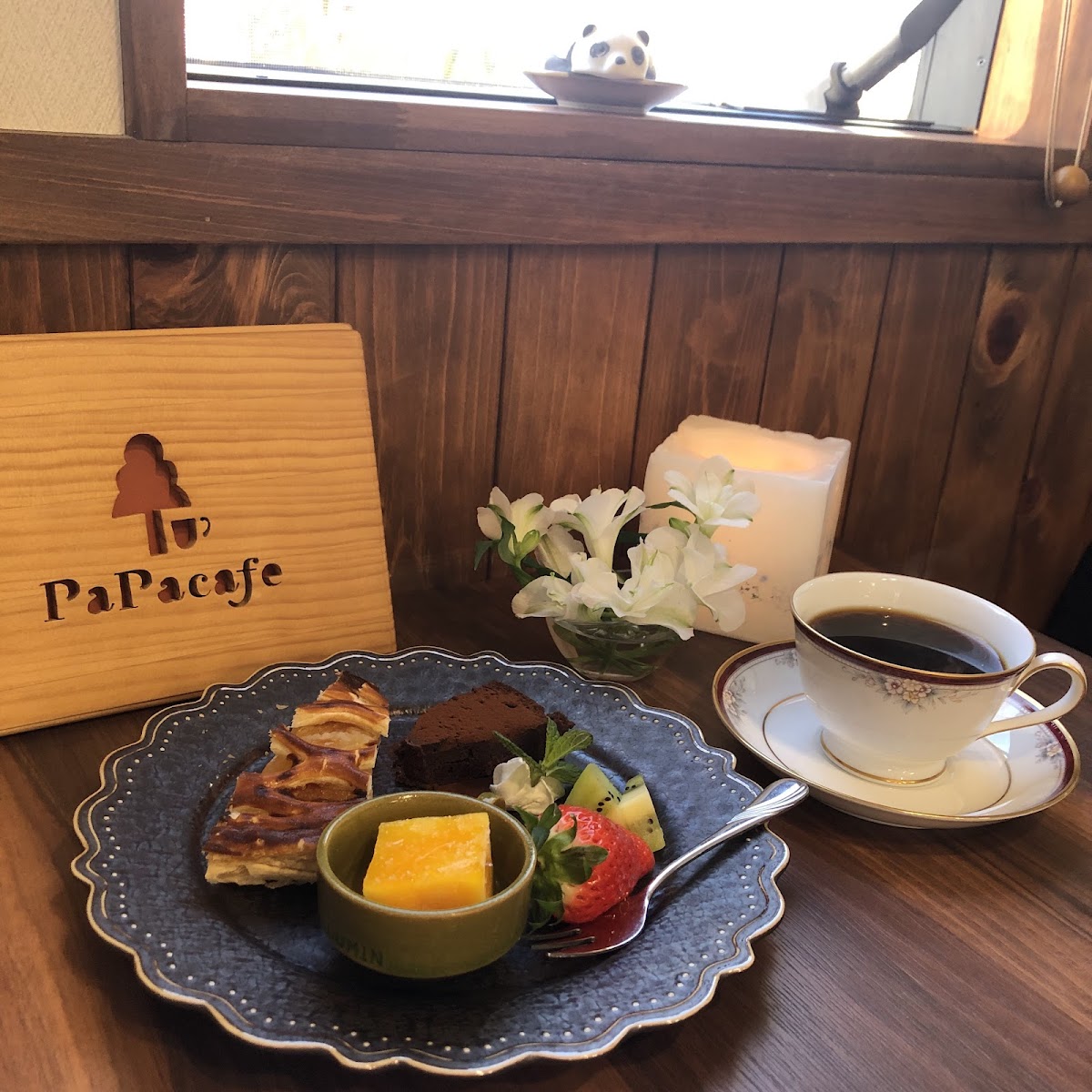 Coffee is a clear highlight here. PaPa Cafe offers both deeply roasted and medium roast options, and the popular iced cafe au lait stands out visually with its distinct layered look. Regulars mention the coffee as approachable yet carefully balanced, pairing naturally with the desserts. The dessert plate is a nice way to sample a little of everything—seasonal fruits, different sweets, and on occasion, a monthly special like a pumpkin baked cheesecake that pairs well with their coffee selection.